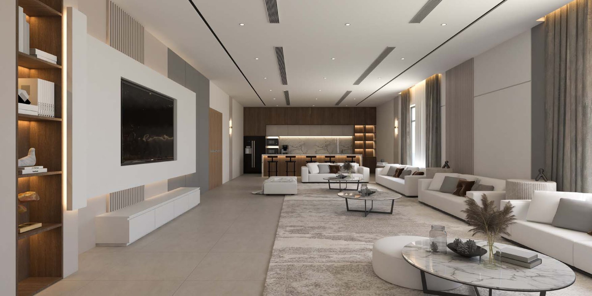 A modern and spacious Majlis with elegant seating, warm lighting, and a welcoming atmosphere. The open layout connects seamlessly to a stylish pantry with a bar counter and modern finishes, creating the perfect space for gatherings and hospitality.