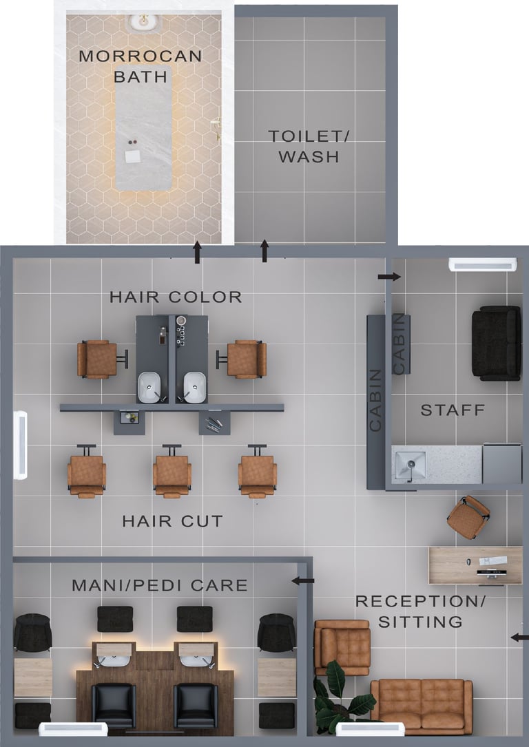 A modern and spacious Majlis with elegant seating, warm lighting, and a welcoming atmosphere. The open layout connects seamlessly to a stylish pantry with a bar counter and modern finishes, creating the perfect space for gatherings and hospitality.